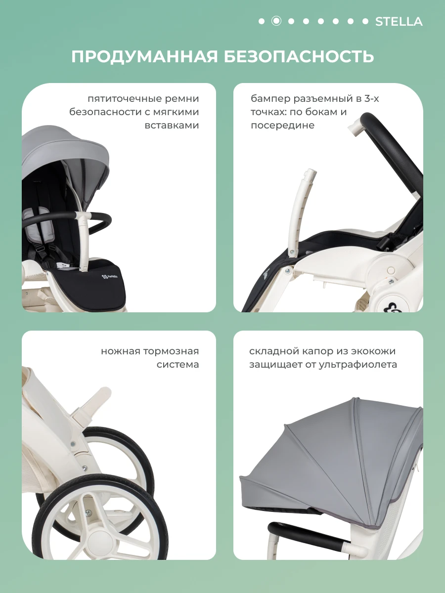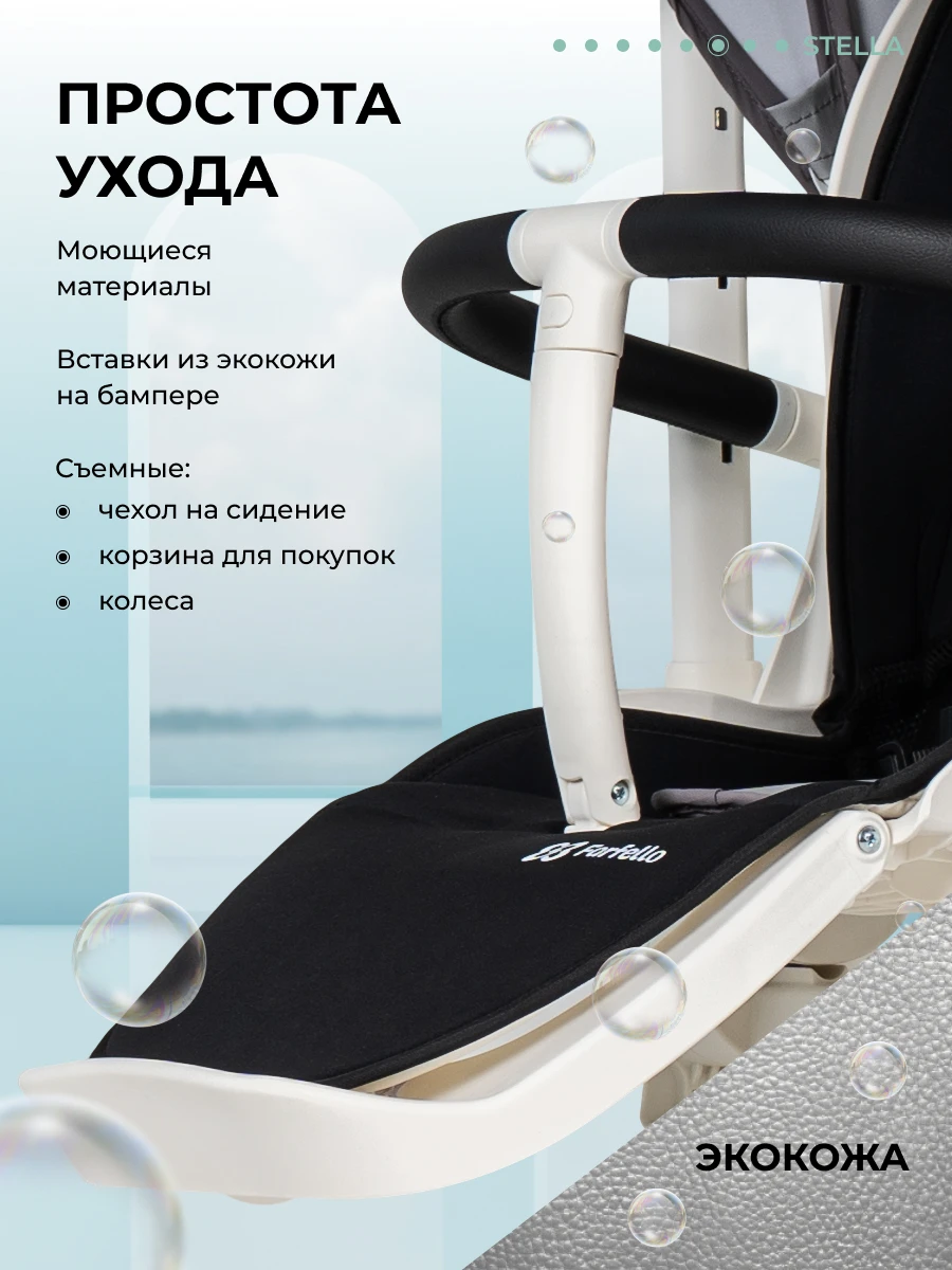 • Моющиеся материалы, вставки из экокожи на бампере и родительской ручке. Колёса, чехол на сидение и корзина съёмные.