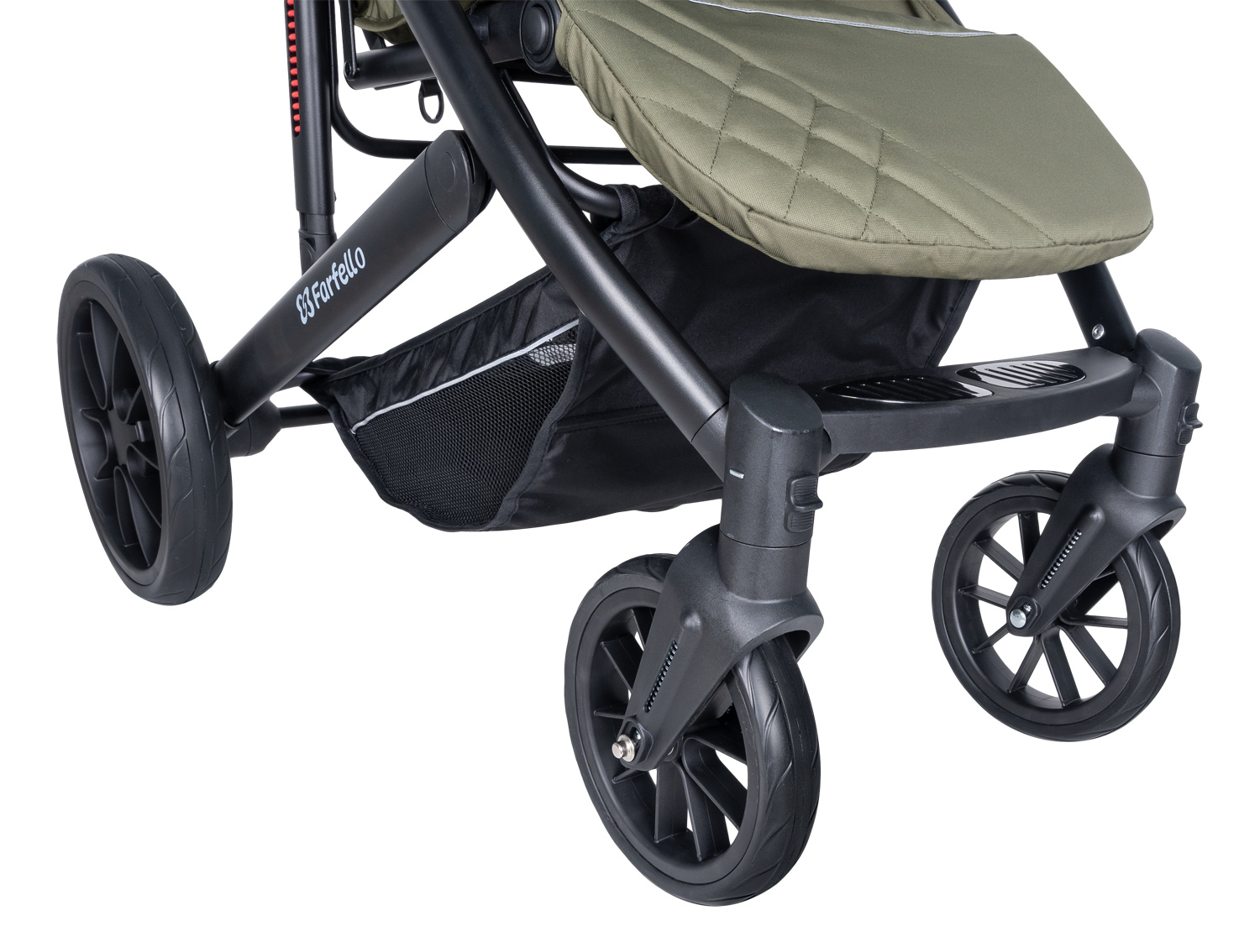 - колеса PU с протектором, плавны в ходу, не шумят при движении, устойчивы к повреждениям, не требуют подкачки. Увеличенные в диаметре задние колеса снимаются, чем значительно облегчают уход за ними после прогулок. Маневренности в движении добавляют вращающиеся на 360° передние колеса с функцией фиксации;